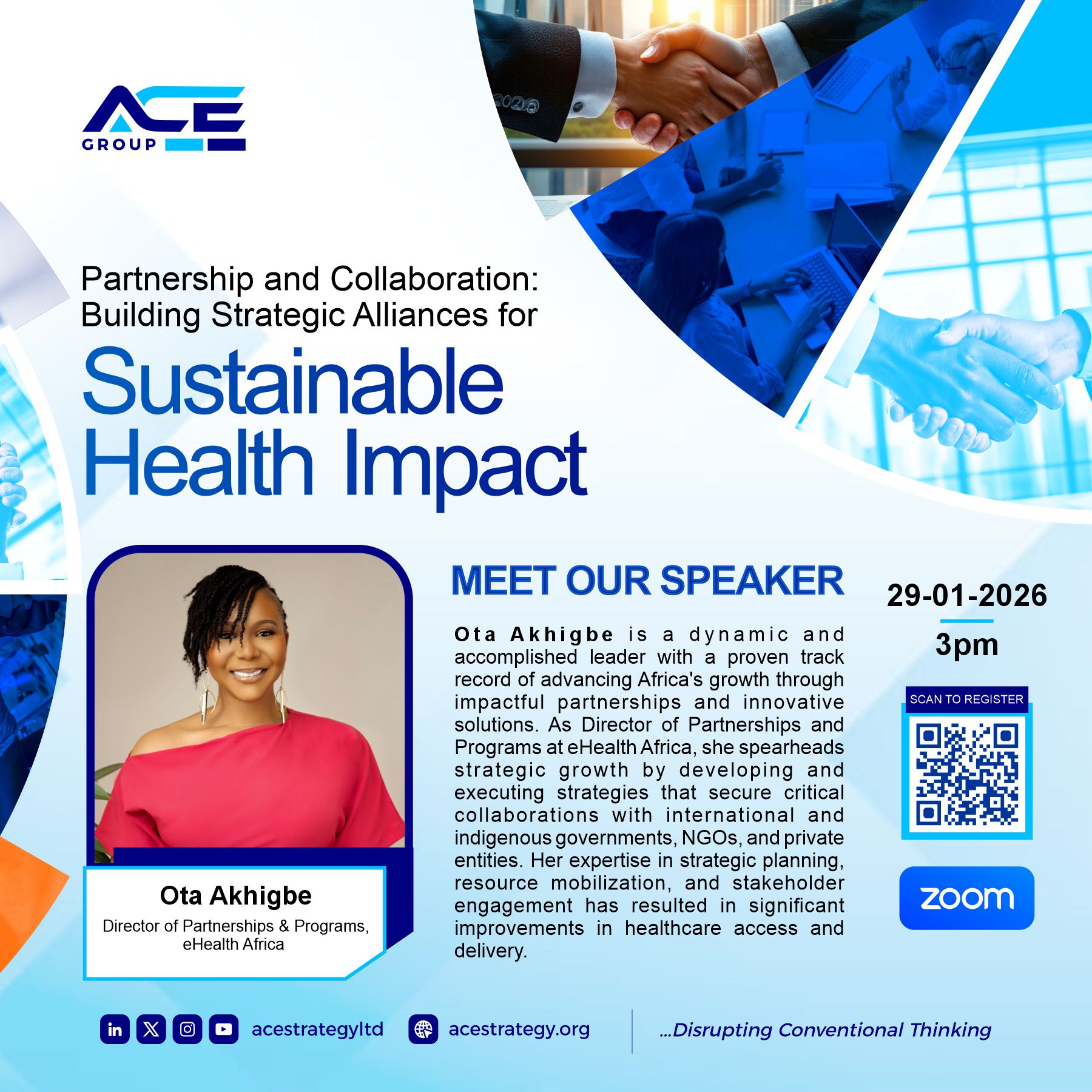 Delivered a keynote and joined panelists at the ACE Group Webinar, sharing insights on building strategic partnerships for sustainable health impact. (January 2026)